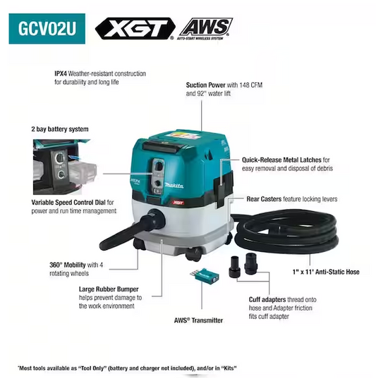 Makita 40V max XGT Brushless Cordless 2.1 Gallon HEPA Filter Dry Dust Extractor, with AWS (Tool Only)