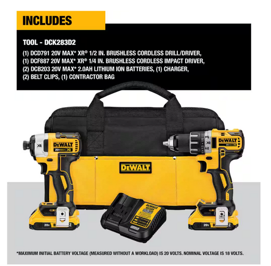 DEWALT 20V MAX XR Cordless Brushless Drill/Impact 2 Tool Combo Kit with (2) 20V 2.0Ah Batteries and Charger -DCK283D2